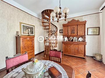 Il piano primo è accessibile sia da una scala a chiocciola che troviamo nel salone del piano terra, sia da una scala esterna che troviamo nel secondo ingresso pedonale della villa. Dalla scala esterna entriamo in un lungo disimpegno su cui si affacciano tutti gli ambienti quali un doppio salone, una sala da pranzo con attigua l'angolo cottura da cui accediamo al bagno, e alla zona notte composta da tre camere da letto di cui una matrimoniale.