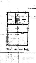 Al piano secondo: due camere, un bagno con antibagno, due soffitte, vano scala. Separatamente dal corpo della villa, al piano terra, si estendono il garage e il deposito. Estesa area scoperta comune adibita a giardino, area di manovra e parcheggio ed altri, suddivisa internamente da una recinzione con muretto e due cancelli.