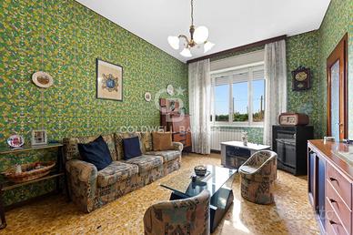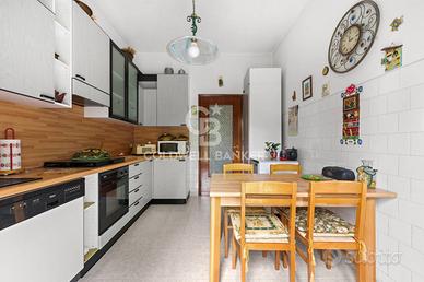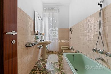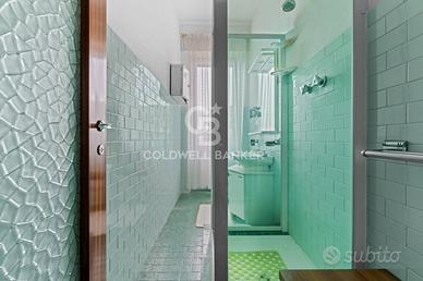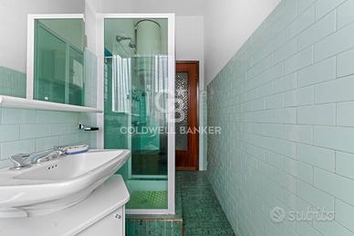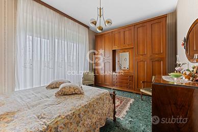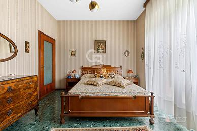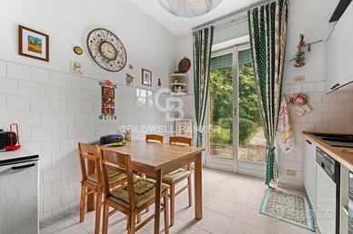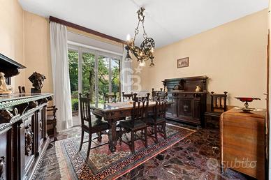 Il piano abitativo, al primo piano, si apre su un generoso disimpegno che conduce alla zona giorno composta da una doppia sala pranzo/soggiorno con affaccio diretto sul giardino, e una cucina abitabile anchessa con uscita esterna. Un locale attualmente adibito a sala del tè può essere trasformato in studio o terza camera. La zona notte comprende due camere matrimoniali, entrambe con accesso diretto a un lungo balcone panoramico affacciato sul verde, e due bagni finestrati, uno con vasca e uno con box doccia.
