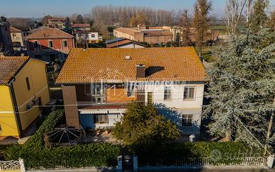 Costruzione degli anni '70, facciata in intonaco ed inserti in mattoni a vista, tetto a falde originale. Il fabbricato presenta due ingressi (uno principale fronte strada che conduce ai due appartamenti, l'altro secondario laterale conduce ai vani accessori ed al vano scala). A livello di finiture troviamo: infissi legno con vetro singolo, zanzariere e tapparelle, presenza di secondo infisso esterno nei due ingressi e nella porta finestra del balcone; porte interne in legno da - Classe: D