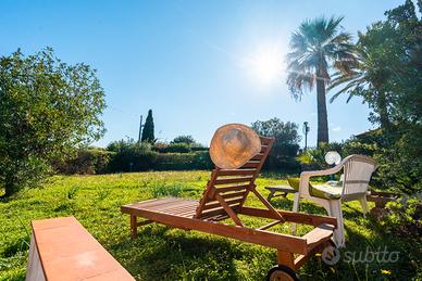 La casa è inoltre circondata da 500 mq esterni distribuiti adeguatamente tra un giardino rigoglioso, delimitato da tipiche piante nostrane come il mirto e il corbezzolo, e da ampi patii: quello più spazioso e accogliente è attrezzato con panche a sedere e un barbecue. Il luogo ispira un immenso senso di pace e di calore e la mescolanza dei colori e dei profumi tipici della Sardegna, non possono che trasmettere serenità e spensieratezza, ma soprattutto...una gran voglia di vacanza!