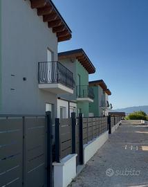 Proponiamo in vendita una villa a schiera di nuova costruzione composta da soggiorno, cucina, bagno, al piano primo tre camere, bagno, balconi e terrazzo. Box auto singolo, cantina, giardino esclusivo con porticato.