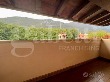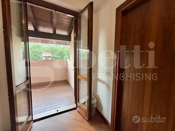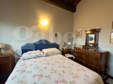Una suggestiva parete in vetro separa la zona giorno dalla scala principale, che conduce ai piani superiori, dove trovano spazio tre camere da letto caratterizzate da soffitti alti con travi in legno a vista, due bagni finestrati e una terrazza coperta con splendida vista sul colle di Botticino.