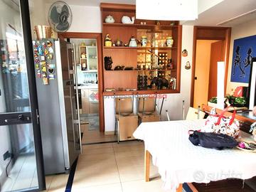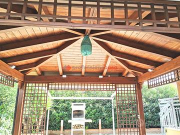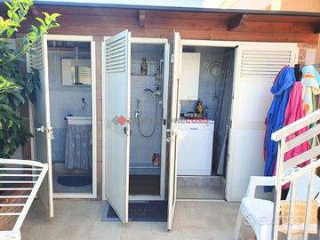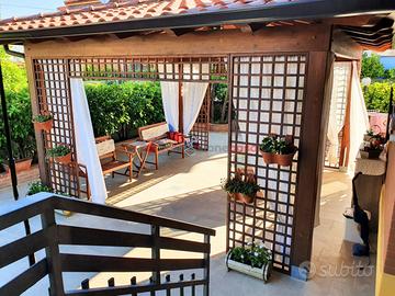 Il giardino, un'oasi di relax, è parzialmente piantumato e dotato di impianto di irrigazione automatico, mentre l'area pavimentata ospita un elegante ed ampio gazebo in legno e due moderne pergotende con apertura elettrica e illuminazione integrata. Completano l'area esterna tre cabine, adibite rispettivamente ad un ulteriore bagno, lavatoio e doccia, oltre ad un'ampia zona lavanderia situata nel sottoscala, offrendo ulteriore comodità per chi ama vivere all'aperto.