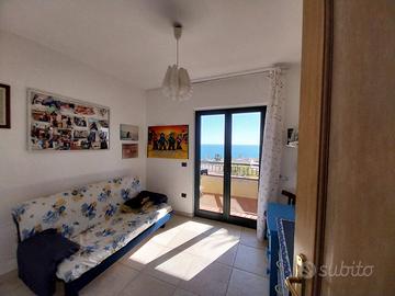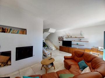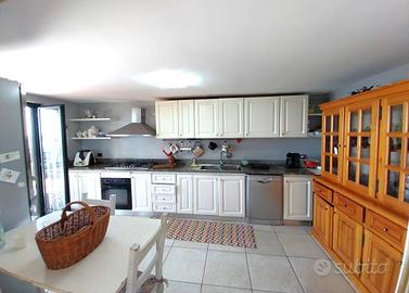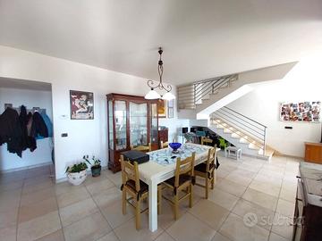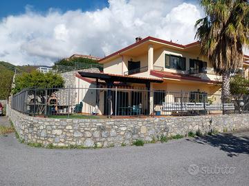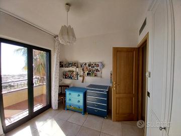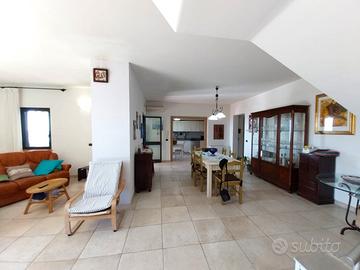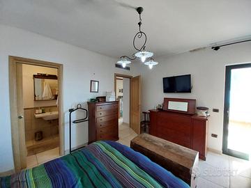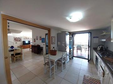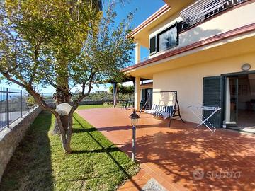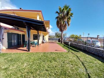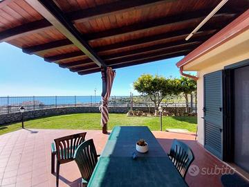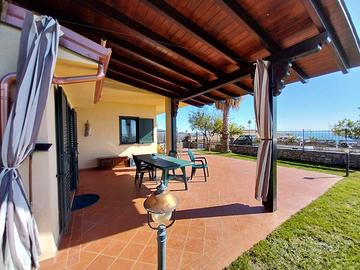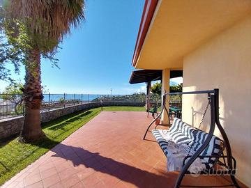 al piano terra troviamo salone doppio, cucina abitabile, bagno, ampio ripostiglio, portico di circa 20 mq, ampio giardino da cui si può ammirare finanche il mare e posto auto; al primo piano sono presenti tre camere, due bagni (di cui uno in camera), e due vista mare. La villa dispone di doppi infissi in alluminio con persiana orientabile all'esterno e vetrocamera all'interno, aria condizionata, riscaldamento autonomo e camino.