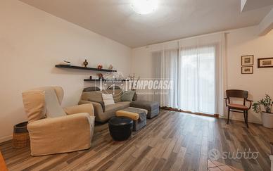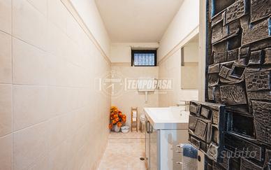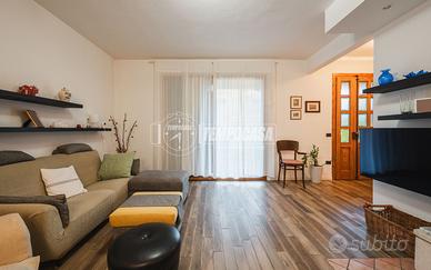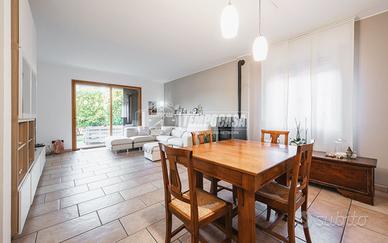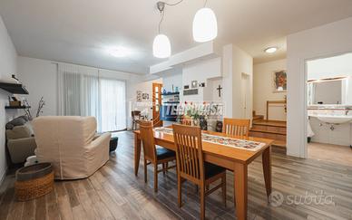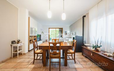 Accolti da un prima area cortiliva, e con accesso da un portico loggiato, al piano terra è presente un'ampia zona living di generose metrature. Una graziosa porta finestra che da accesso al giardino, garantisce un'ottima luminosità e ventilazione. In continuità con la zona living, divisa da una comoda porta scorrevole in vetro/legno, troviamo la cucina abitabile con mobilio realizzato su misura e un'isola centrale. Anch'essa con accesso esterno su un primo balcone, con vista panoramica. Completa il piano un ampio bagno servito di box doccia.