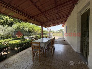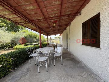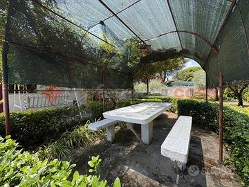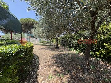 Il villino della superficie utile di 60 mq. beneficia di un'ampia terrazza con portico, arredata per vivere piacevoli momenti all'aperto, un morbido giardino angolare di 450 mq. adornato da curate siepi e piante di ulivo, dove trova spazio un'altra zona pranzo al coperto e la possibilità di parcheggiare l'auto in penombra.