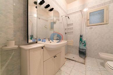 Internamente, invece, si compone di un ampio soggiorno, una cucina abitabile, due camere da letto, entrambe di dimensioni matrimoniali, due bagni, entrambi finestrati e di cui uno con accesso diretto da una delle camere da letto, ed un comodo ripostiglio.