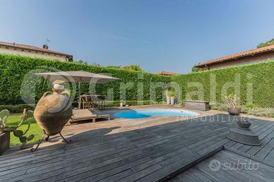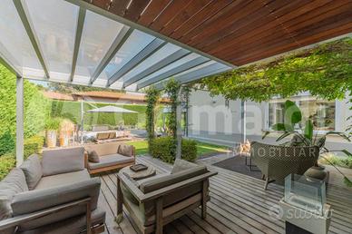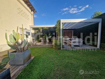 L'esterno è caratterizzato da una grande veranda chiudibile con affaccio sul giardino piscina e solarium inseriti in un contesto di piante grasse e tropicali.