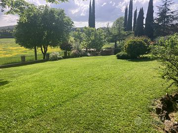 Un cancello in ferro battuto, sorretto da colonne in pietra, conduce all'interno della proprietà; lo spazio esterno è caratterizzato da un ampio giardino pianeggiante e da un porticato coperto, sfruttabile in tutte le stagioni dell'anno e impreziosito da possenti colonne in mattoni e pietra.