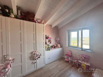 Al piano superiore, la zona notte ospita tre camere da letto, di cui una padronale con cabina armadio, due bagni finestrati e uno splendido terrazzo panoramico, da cui godere di una vista mozzafiato sulle colline circostanti.