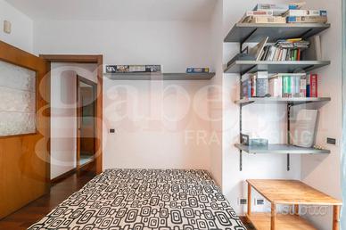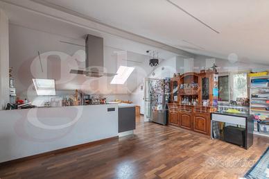 Appartamento al piano mansardato: ampio locale living con zona conversazione e cucina a vista con penisola, disimpegno, due camere e servizi.