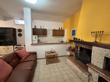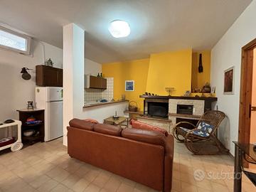 Piano seminterrato: taverna con camino, angolo cottura a vista, bagno con doccia e camera da letto.