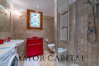 Gli interni, eleganti e funzionali, sono perfetti per accogliere famiglie o gruppi di amici. Larredamento, ricercato e realizzato su misura, include armadi a muro progettati per ottimizzare gli spazi e mantenere unestetica coerente e raffinata in ogni ambiente.