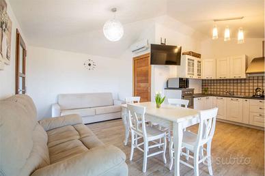 Immersa nella bellezza incontaminata della rinomata località turistica di Chia, a pochi passi dalle splendide spiagge cristalline che offre la zona, proponiamo in vendita un'elegante villa capo schiera su due livelli sita in un'oasi di tranquillità e raffinatezza. Questa proprietà esclusiva, caratterizzata da ampi spazi esterni e un design ricercato è la soluzione ideale per chi desidera vivere in un contesto unico e suggestivo. La casa, strutturata su due livelli, presenta l'ingresso su un curato giardino di circa 30 mq, attrezzato con doccia esterna, per godersi i momenti di relax dopo una giornata di mare. Dalla porta finestra accediamo alla spaziosa camera da letto matrimoniale, al bagno completo di doccia e ad ulteriore vuoto tecnico. Tramite la scala esterna raggiungiamo il primo piano dove troviamo una profonda terrazza a livello con veranda di circa 40 mq dalla quale è possibile godere di un'ottima vista sul mare. La terrazza, in parte coperta con pergolato in legno è dotata di barbecue ed è l'ideale per accogliere gli ospiti per pranzi e cene all'aria aperta. Il piano superiore è organizzato da una comoda zona giorno con angolo cottura a vista ed un secondo bagno in stile moderno, anch'esso completo di doccia. La villa è caratterizzata da rifiniture di pregio e materiali di alta qualità, scelte con cura per creare un'atmosfera elegante e raffinata. L'immobile è dotato di split inverter caldo/freddo in tutti gli ambienti e infissi in pvc con doppio vetrocamera a basso emissivo. Completano l'immobile due posti auto di proprietà, per la massima comodità e sicurezza. RIFERIMENTO: VIa Pascoli. CLASSE ENERGETICA: C