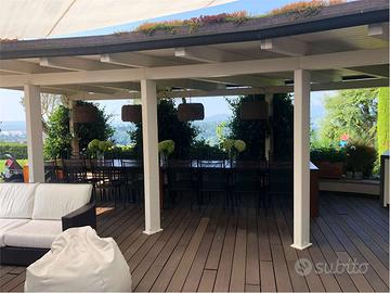 All'esterno, oltre alla piscina, una grande zona living coperta con cucina, barbecue, zona pranzo, jacuzzi, zona giochi per bambini.
