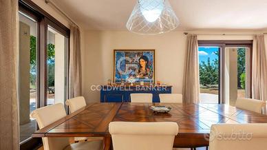 Allesterno, il parco curato è arricchito da piante mediterranee di grande pregio, ulivi e agrumeti, mentre i tipici muretti a secco e i rivestimenti in pietra locale conferiscono autenticità e continuità con il paesaggio circostante. La piscina e lampia zona barbecue rendono gli spazi esterni funzionali e di rappresentanza, garantendo momenti di relax e convivialità in assoluta privacy.
