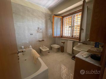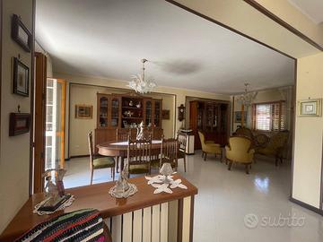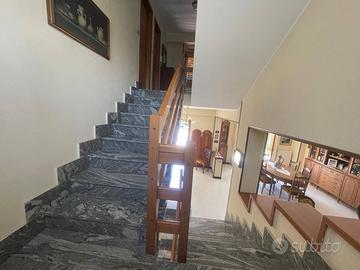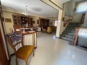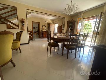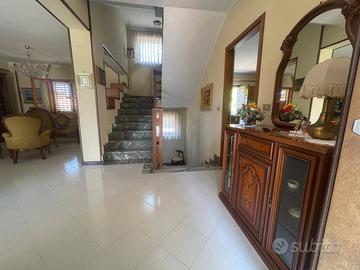 Composizione degli ambientiPiano rialzato: ampio salone, cucina abitabile, studio e bagno di servizio.Primo piano: tre spaziose camere da letto e doppi servizi, di cui uno in camera.Secondo piano: camera matrimoniale, due camerette, ripostiglio e bagno.Piano seminterrato: garage ampio, taverna attrezzata con camino e grande dispensa.Circondata da curati spazi verdi, la villa offre un ambiente ideale per chi desidera vivere nella tranquillità e nel comfort, senza rinunciare alla comodità dei servizi cittadini facilmente raggiungibili in pochi minuti.