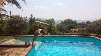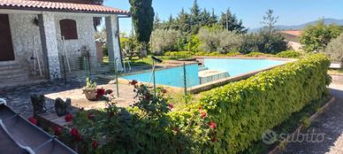 Ristrutturata nel 2018 è composta da due unità con ingresso autonomo e su unico piano, rispettivamente di 114 mq composta da cucina abitabile aperta su un piccolo portico, due camere, bagno e ampio salone con camino. La seconda di 75 mq composta da cucina con ampio portico che affaccia sulla piscina, due camere e bagno. E' presente un piano interrato di circa 90 mq che porta ai due garage indipendenti di circa 30 mq cad. Tutto l'edificio è contornato da uno splendido giardino, frutteto ed oliveto di circa 5500 mq. In esso si trova la piscina interrata di 60 mq una stalla per i cavalli, un garage esterno con possibilità di trasformarlo in dependance con contatore elettrico già installato. Inoltre è presente una struttura in cemento armato e vetro di circa 50 mq, una volta adibita a voliera. Sono presenti pannelli solari termici, caldaia a pellet, doccia esterna alla piscina.