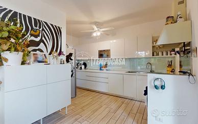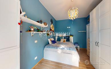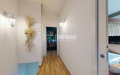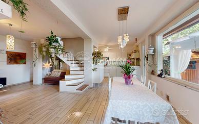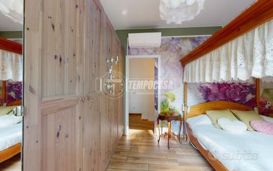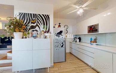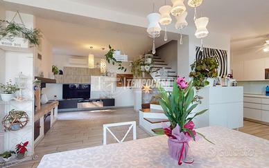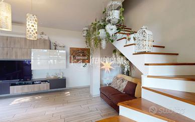 Al piano terra l'ingresso si apre su un luminoso soggiorno di generose dimensioni, impreziosito da un camino ventilato dotato di tre bocchettoni per la diffusione dell'aria calda, che crea un'atmosfera accogliente e intima. La cucina a vista è moderna e ben integrata nella zona giorno, rendendo l'ambiente perfetto per la convivialità. Sempre al piano terra troviamo una comoda lavanderia e un bagno finestrato con box doccia. Al piano superiore si sviluppa la zona notte, composta da tre camere da letto - di cui una matrimoniale climatizzata e due camerette predisposte per l'impianto di condizionamento - e un secondo bagno, anch'esso completo di box doccia.