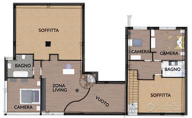Primo piano: zona lIving, camera matrimoniale, bagno finestrato e soffitta.