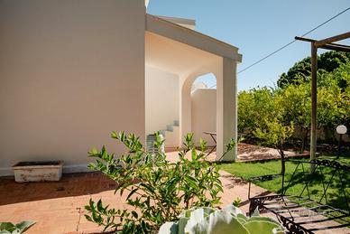 Dal salone si accede ad un ampio portico panoramico, vero cuore pulsante della casa: qui lo sguardo si perde sulla costa di Scopello e sul mare cristallino che abbraccia la Riserva dello Zingaro, regalando scenari che mutano con la luce del giorno e tramonti spettacolari.