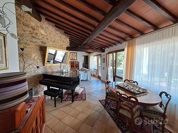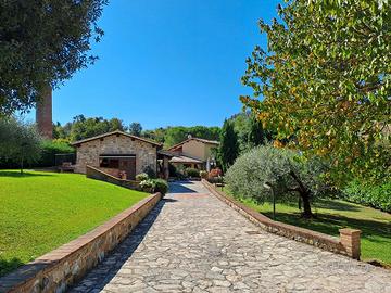 Bella proprietà formata da Casale articolato da più corpi, circa 300 mq con due saloni, tre camere, tre bagni, lavanderia, garage, casina per attrezzature, all'interno di un terreno di 10000 mq in parte a parco, area piscina con locali servizi, due laghetti per irrigazione, accesso diretto da strada asfaltata.