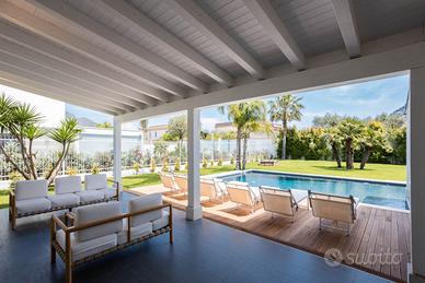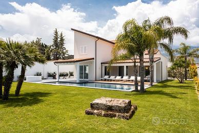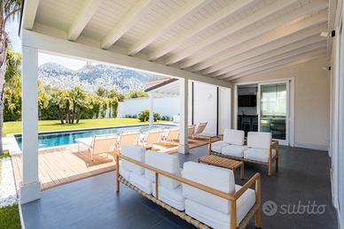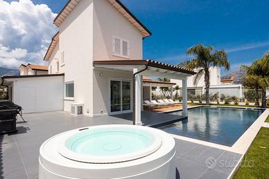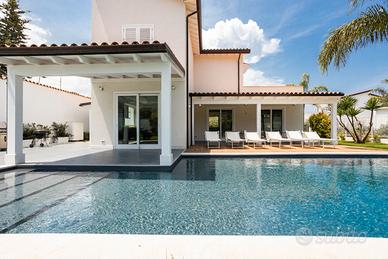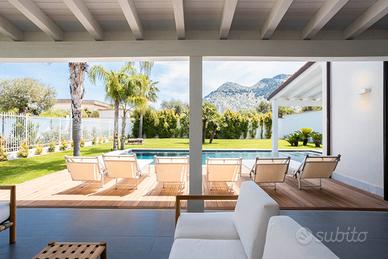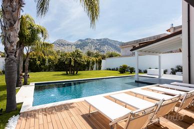 In una delle zone più esclusive e tranquille di Mondello, in Via Castelforte, sorge un'elegante villa unifamiliare di circa 196 mq, immersa in un rigoglioso giardino privato di 700 mq con piscina e vasca idromassaggio.