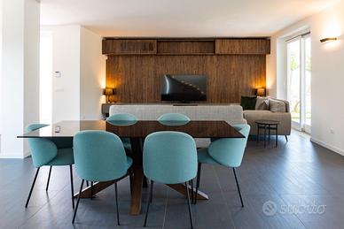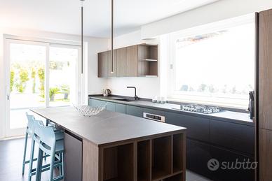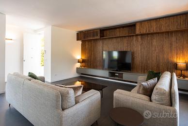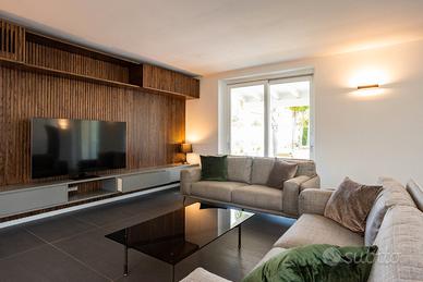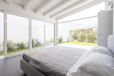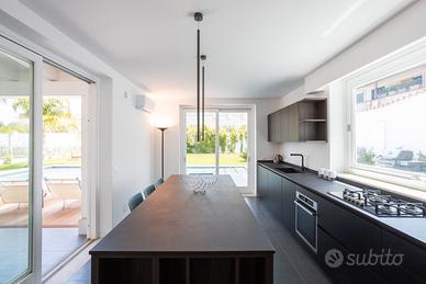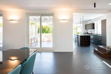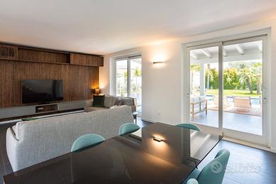L'ingresso si apre su un ampio salone doppio, luminoso e accogliente, con grandi vetrate panoramiche che si affacciano sul giardino e sulla piscina, creando una continuità armoniosa tra interno ed esterno. Adiacente al salone si trova una cucina a giorno moderna e completamente accessoriata, ideale per momenti conviviali e pranzi in famiglia. Sempre al piano terra si trovano una camera da letto ed un bagno.