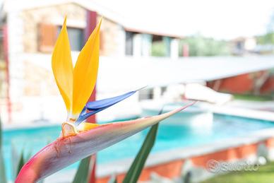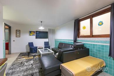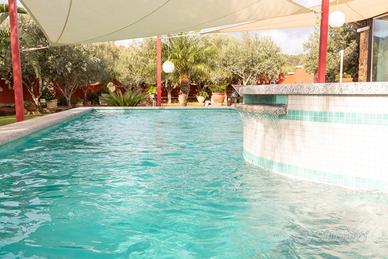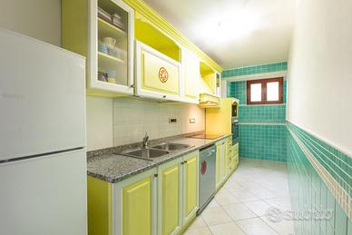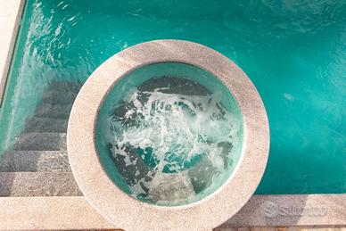 La villa al piano terra è composta da zona giorno con angolo cottura, due camere da letto, disimpegno, bagno con ampia doccia, sanitari sospesi e mobile lavabo, spaziosa veranda di oltre 26mq chiusa con delle scenografiche "VEPA" vetrate panoramiche scorrevoli che si affacciano sul curato giardino e piscina di 40 mq rivestita con uno splendido mosaico, dotata di nuoto contro corrente, vasca idromassaggio separata e riscaldata, luci led multi color, bordo vasca e gradini in granito locale.