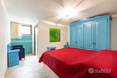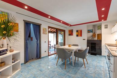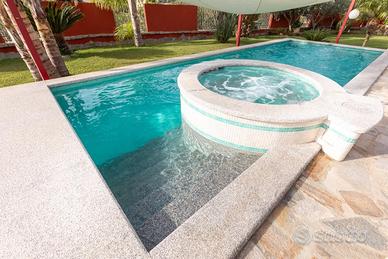 La villa al piano terra è composta da zona giorno con angolo cottura, due camere da letto, disimpegno, bagno con ampia doccia, sanitari sospesi e mobile lavabo, spaziosa veranda di oltre 26mq chiusa con delle scenografiche "VEPA" vetrate panoramiche scorrevoli che si affacciano sul curato giardino e piscina di 40 mq rivestita con uno splendido mosaico, dotata di nuoto contro corrente, vasca idromassaggio separata e riscaldata, luci led multi color, bordo vasca e gradini in granito locale.