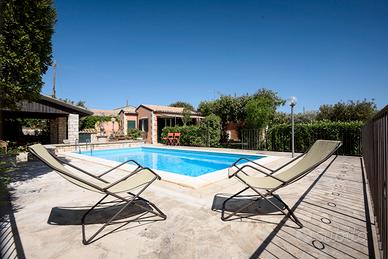 La villa si trova a soli 1,5 km dal centro abitato. In dotazione: Impianto fotovoltaico 5,6 kw con incentivo conto energia 2012 Impianto solare termico Caldaia Gpl Climatizzatori Stufa ferro e ceramica a legna Termo camino Van coiler nel living 3 antenne con parobola satellitare Impianto antenne per servizio internet via radio + wifi interno Impianto di allarme interno Videosorveglianza con 4 telecamere esterne Pozzo trivellato Cisterna con 2 pompe sommerse ( giardino + case) ed impianto di distribuzione con centralina inverter Trattamento acqua anti calcare 3 fosse settiche ( 2 imhoff) Cantina Garage 2 ingressi carrabili Piscina 4x8 m. con impianto automatico di clorazione a sale. 1000 mq giardino residenziale con prato e robot tagliaerba 2000 mq di giardino piantumato con olivi e carrubbi 2 ingressi carrabili Ideale come residenza di pregio o uso turistico ( attualmente le dependance sono utilizzate come casa vacanza con licenza comunale e CIN per affitto breve). Trattativa riservata a solo interessati, NO PERDITEMPO.