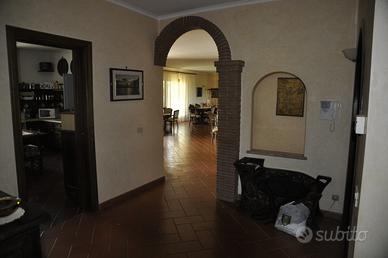 PIANO STRADA ingresso, grande salone con camino e terrazzo- corridoio con 5 camere di cui 2 con terrazzo-3 bagni- grande cucina con veranda coperta e giardino 2000 mq. - Scala interna che porta al PIANO SOTTOSTANTE con entrate esterne indipendenti: taverna 100 mq.con bagno + garage 100mq. con bagno.