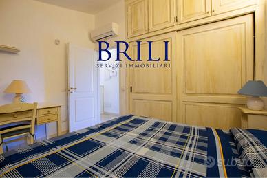La zona notte comprende un disimpegno, un bagno finestrato con doccia e due camere da letto, di cui una con affaccio sul giardino e vista mare. Al piano interrato si trovano una cantina e un secondo bagno, spazi utili e funzionali.