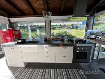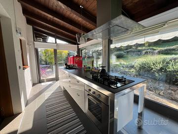 La villa, parzialmente arredata con cucina, si sviluppa su due livelli per una superficie complessiva di oltre 200 mq. Al piano principale troviamo un ampio e luminoso soggiorno con cucina a vista moderna, una camera matrimoniale con bagno privato e cabina armadio, una camera singola, un ulteriore bagno e una zona studio. Gli ambienti sono ariosi e accoglienti, valorizzati da grandi finestre che si affacciano sul giardino privato e garantiscono una splendida luminosità naturale.