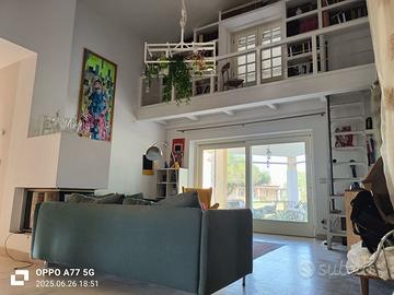 Al piano terra, l'ingresso, ampio soggiorno/sala da pranzo illuminato da grandi finestre che offrono una vista incantevole sul giardino e sulla piscina a sfioro. La cucina abitabile, attrezzata con una moderna cucina americana, è perfetta per chi ama cucinare e intrattenere, un bagno.