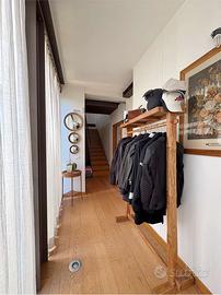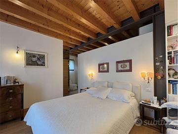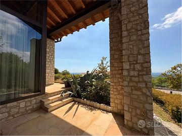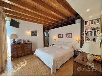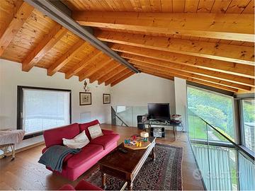 Una raffinata scala conduce al piano superiore dove trovano spazio unarea soppalcata per lo studio o il relax, una camera per gli ospiti, un ulteriore bagno e un terrazzo abitabile con vista aperta sulla vallata.