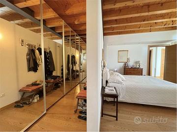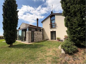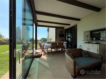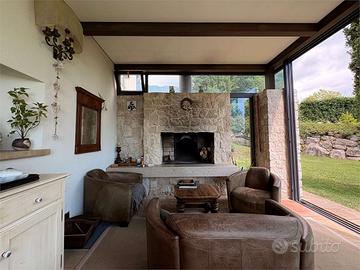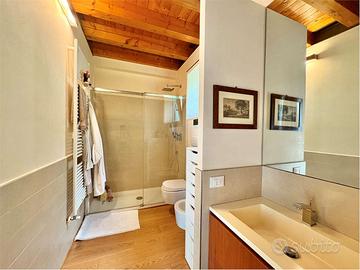 Al piano terra si accede a un ampio soggiorno con soffitti alti, adiacente alla cucina abitabile e a una splendida veranda attrezzata con camino, ideale per vivere momenti conviviali in tutte le stagioni. La zona notte ospita due camere da letto, entrambe con bagno privato, e una cabina armadio.