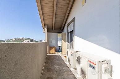 Il piano superiore, caratterizzato da tetto a spioventi con travi in legno a vista di colore bianco, è composto da tre camere da letto di cui due singole, una matrimoniale, un bagno completo di box doccia e scalda salviette e infine due balconi con zona lavanderia dai quali si può godere di un'ottima vista sulla città.