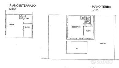 - Piano interrato: grande cantina con aerazione tramite bocche di lupo, ulteriore cantina che ospita anche la centralina impiantistica e lavanderia completa di wc.