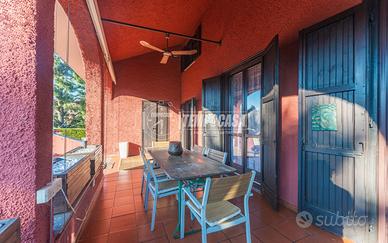 Completa la soluzione un ampissimo giardino che circonda l'intera proprietà con piscina interrata. Troviamo inoltre due posti auto coperti da tettoia e una cabina adibita a deposito attrezzi.