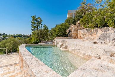 Rif: CBI094-1877-64058 Classe energetica: D - EPglnr: 146.36 kWh/m² PUGLIA - FASANO (BR) SELVA DI FASANO - VIA DEI CESPUGLI ELEGANTE VILLA PANORAMICA CON VISTA MARE NELLA SELVA DI FASANO In posizione dominante sulle colline della Selva di Fasano, questa villa esclusiva si integra armoniosamente nel paesaggio mediterraneo, offrendo un panorama mozzafiato che abbraccia il mare Adriatico e la valle sottostante. La proprietà è composta da tre corpi di fabbrica, ciascuno con caratteristiche uniche. Il corpo principale, di 130 mq commerciali, presenta linee moderne ed eleganti. Lingresso conduce in un ampio e luminoso open space con grandi superfici vetrate che incorniciano la vista. La zona giorno si completa con una cucina moderna e una camera da letto, creando un ambiente raffinato e accogliente. All'esterno, davanti la veranda, un sentiero di ghiaia chiara, incorniciato da pietre, conduce naturalmente verso il punto d'osservazione, un'ampia terrazza di circa 130 mq delimitata da eleganti parapetti in vetro che sembra sospesa sul paesaggio circostante e sulla vallata. Il secondo corpo, una tipica lamia di 75 mq commerciali, aggiunge il fascino della tradizione pugliese. Comprende due camere da letto, un bagno, una cucina e un terrazzamento ideale per momenti di relax allaria aperta con vista panoramica. Unelegante scala con battute in legno porta a un ambiente straordinario: uno specchio d'acqua incastonato nella roccia, perfettamente integrato nel contesto naturale, affiancato da un solarium suggestivo e protetto di circa 35 mq, ideale per godersi le belle giornate pugliesi. A completare la proprietà, un caratteristico trullo ristrutturato di circa 22 mq, dotato di bagno e ambiente con divano letto, perfetto come dependance o spazio per gli ospiti. Il terreno circostante, di circa 8.000 mq, si estende lungo la collina tra muretti a secco, terrazzamenti e vegetazione tipica, garantendo privacy e autenticità. La villa si trova in posizione...