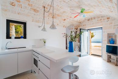 Unelegante scala con battute in legno porta a un ambiente straordinario: uno specchio d'acqua incastonato nella roccia, perfettamente integrato nel contesto naturale, affiancato da un solarium suggestivo e protetto di circa 35 mq, ideale per godersi le belle giornate pugliesi.