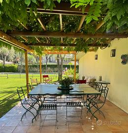 Curato e perfettamente attrezzato, con piscina e doccia esterna, elegante pergolato con zona pranzo, area salotto e ampi spazi verdi ideali per momenti di convivialità e relax.