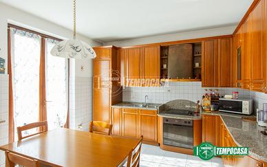 A seguire troviamo la cucina abitabile, anch'essa luminosa e ariosa, dotata di una pratica portafinestra che permette di accedere direttamente al giardino privato, perfetto per pranzi all'aperto, giochi all'aria aperta o per creare una zona relax,