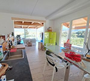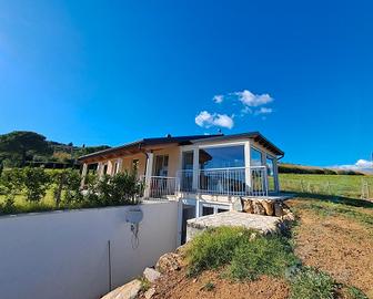 Bellissima Villa ubicata in leggera collina con vista panoramica, classe energetica A 4, formata da un piano seminterrato di 150 mq e un piano terra di 130 mq composto da luminosissimo salone cucina pranzo con serra solare e due porticati, 2 camere, ripostiglio e bagno, circondata da 4000 mq di parco/terreno recintato, autorizzazione per costruire piscina.