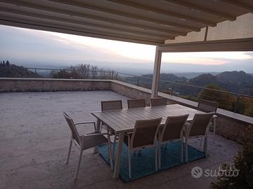 Villa di oltre 350 mq con 4 camere, 4 bagni, studio, cucina, soggiorno, locale caldaia, locale lavanderia, tutti pavimenti e rivestimenti in marmo pregiato, porfido nel piazzale, barbecue in cotto e coppi e secchiaio veneto posti all'esterno, terrazza coperta da gazebo illuminato all'interno e chiudibile elettricamente con vista mozzafiato a sud.