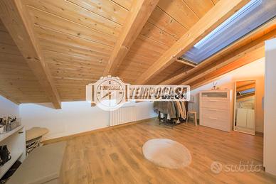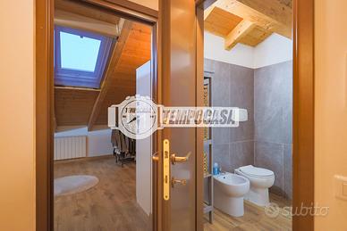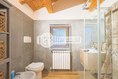 Il piano superiore, impreziosito dal soffitto con travi in legno a vista, ospita la zona notte con due camere e un secondo bagno dal gusto elegante e ricercato.