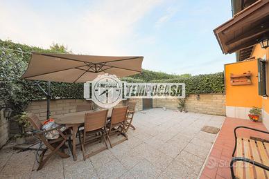 All'esterno, un delizioso spazio privato pavimentato circondato dal verde regala privacy e relax, perfetto per momenti all'aperto o cene in compagnia.
