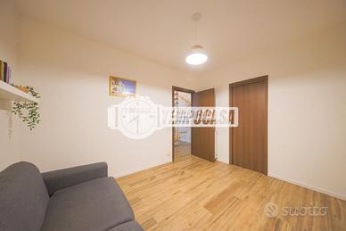 al piano terra troviamo un accogliente soggiorno con cucina a vista, caratterizzato da uno stile moderno dai toni chiari e luminosi, un'ampia camera e un bagno finestrato con doccia.